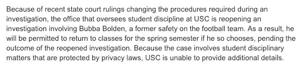 Bubba Bolden may want to return to USC because he loves the university. But the way USC’s statement below is worded doesn’t sound all that embracing: “he will be permitted to return to classes for the spring semester if he so chooses.”