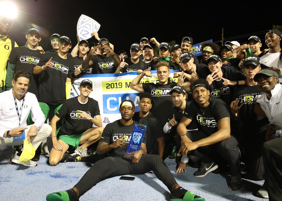 If you disagree, look at the photo of the Oregon men’s track team celebrating its 13th-straight Pac-12 title below. Where is the coach? He’s the guy in the yellow pullover that is barely in the photo. An athlete holds the trophy. There are even some female athletes jumping in. But no one ever upstages the USC track coach.