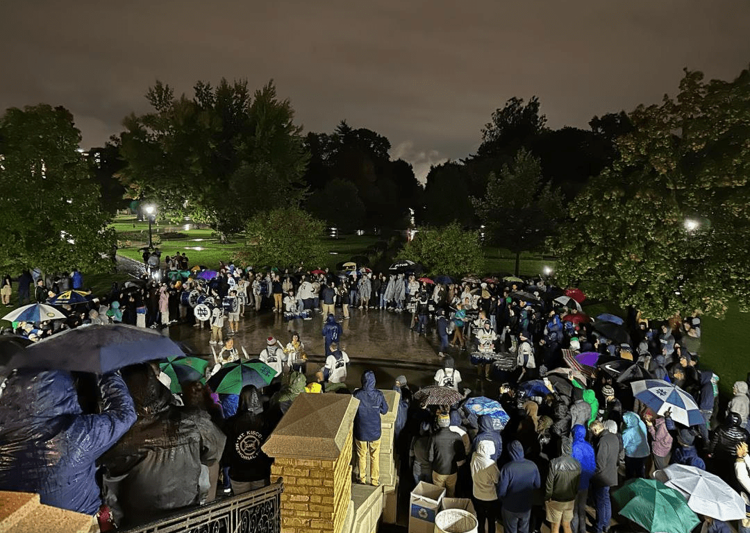 The rain came Friday night during the drummers’ rally at Notre Dame.