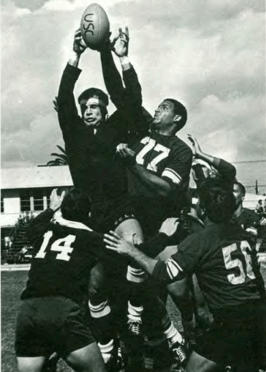 • The USC Rugby team went 13-1-2 in 1967. That’s offensive tackle Mike Taylor (77) playing for the rugby team (below photo). He made a key block in O.J. Simpson’s famous 64-yard run against UCLA.