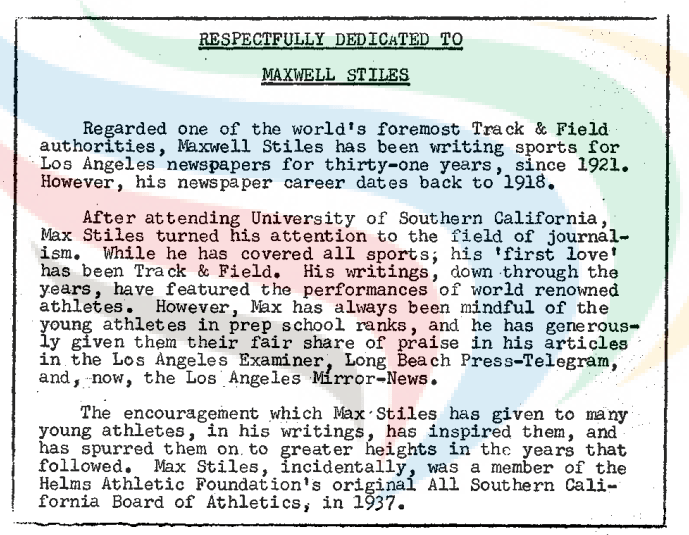 - Track and field used to be a major sport in the United States and there was not a more intense breed of sports writer than those who covered the sport. Here’s a tribute to sports writer Maxwell Stiles, a USC graduate.
