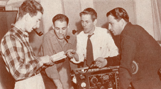 • Have you ever seen the legendary KTLA (Channel 5) reporter Stan Chambers this young? He’s on the far right delivering commentary on the “Check the Scoreboard” sports radio show for USC campus station KTRO. Chambers and Co. are all sporting suits and ties, of course.