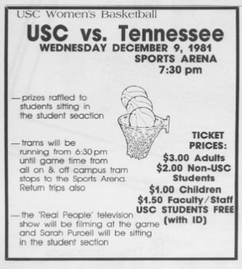 • USC vs. Tennessee in women’s basketball at the Sports Arena and Sarah Purcell sitting in the student section because “Real People” was filming. What more could you ask for?