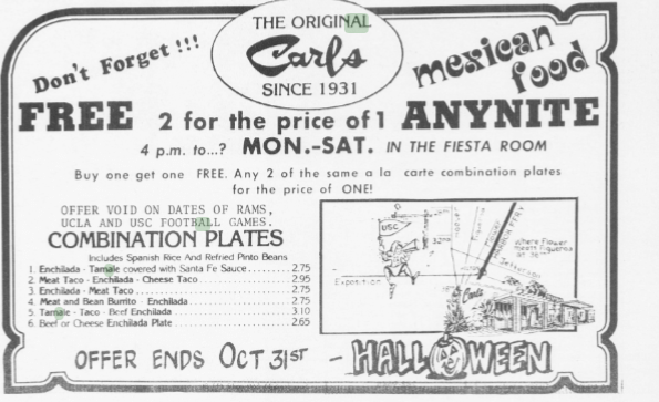 • I’ve written about Carl’s Restaurant before but this ad is from 1977. It was where Figueroa and Flower Streets met, just south of Exposition Blvd. Carl’s ceased doing business in 1979. The site then became a Margarita Jones.