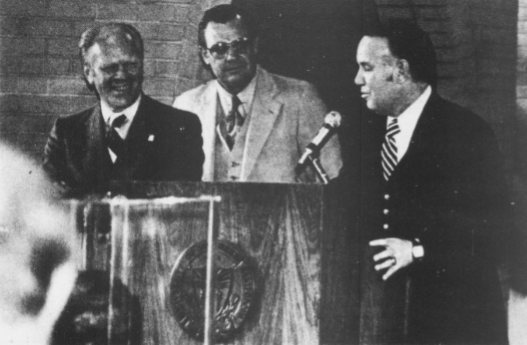 • Former President Gerald Ford, USC athletic Dick Perry and football coach John Robinson at Heritage Hall in 1977 for a reception as Ford met USC coaches and athletes.