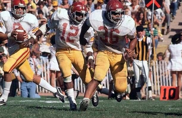Rob Hertel gets ready to throw a pass with Charles White (12) and Mosi Tatupu (36) blocking in 1977.