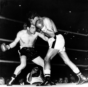 Construction takes shape on the $8.5 million Los Angeles Memorial Sports Arena in Sept., 1958. The arena opened on July 4, 1959 and the first event was a bantamweight title fight between Jose Becerra and Alphonse Halimi and 15,000 attended.