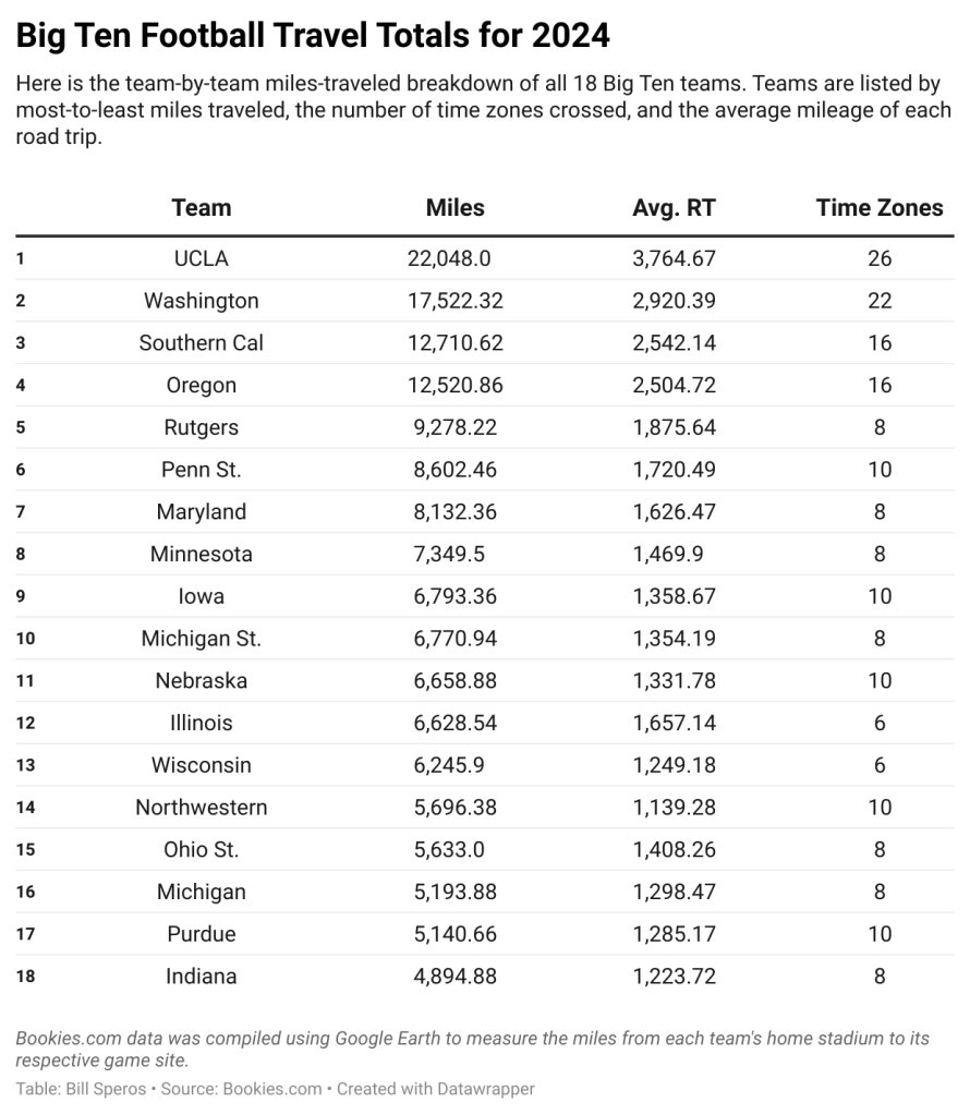 Here are the miles traveled for each Big Ten team according to Bookies.com.
