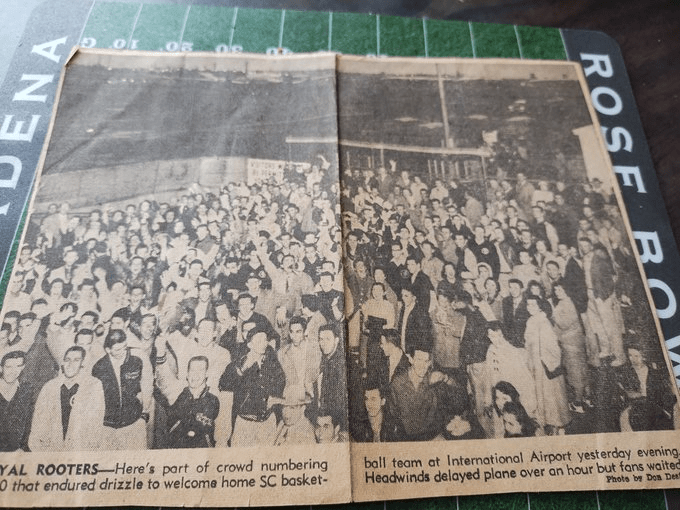 This is part of the crowd of 1,500 USC fans that waited at L.A. International Airport to greet the Trojan basketball team when it returned from the Final Four in 1954. How many do you think would go to the airport today if they could greet the basketball team for a similar accomplishment?