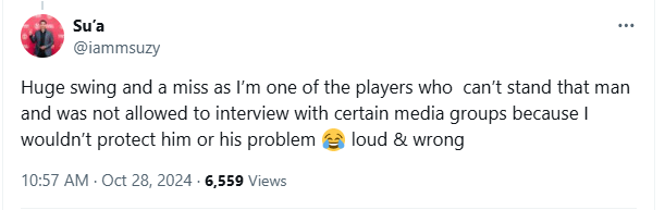 Pretty interesting comment for Sua given he is part of the official use youtube pregame. I wonder if he keeps the job for airing dirty laundry.