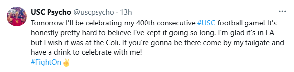 He missed most of the games during the 2020 season so his streak ended. If USC played a game and you did not attend, you cannot pretend the game did not take place.