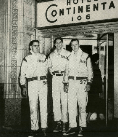 • Here’s a 1954 photo of USC players Roy Irvin, Ludecke (center) and Walter Thompson leaving the Hotel Continental in Kansas City before a Final Four game against Penn State. The Trojans lost to Bradley, 74-72, in a semifinal game and then lost to Penn State, 70-61, in the third-place game.