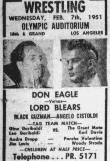 • Note this wrestling card from the Olympic Auditorium in 1951. At the bottom is Woody Strode, who played football at UCLA and was better known as an actor in films like “Spartacus” and “Sergeant Rutledge.”