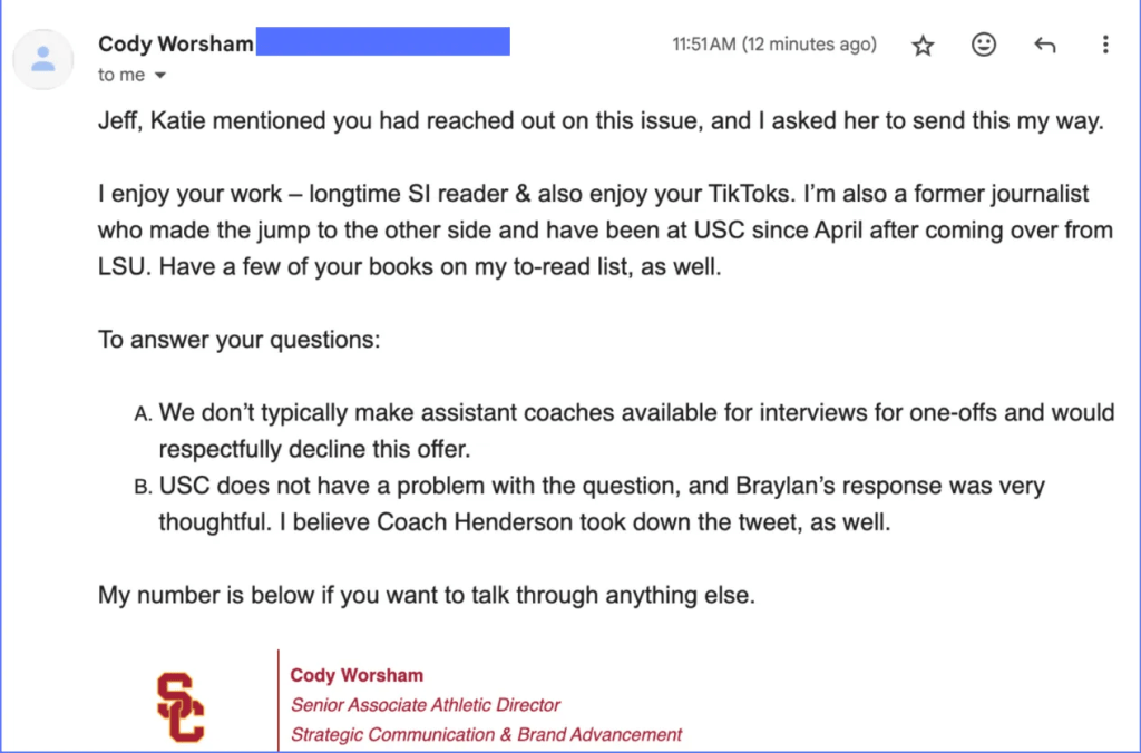 • Sports writer Jeff Pearlman wrote a piece on USC defensive line coach Eric Henderson attacking a reporter on twitter. The most interesting part is he got a response from a USC official.