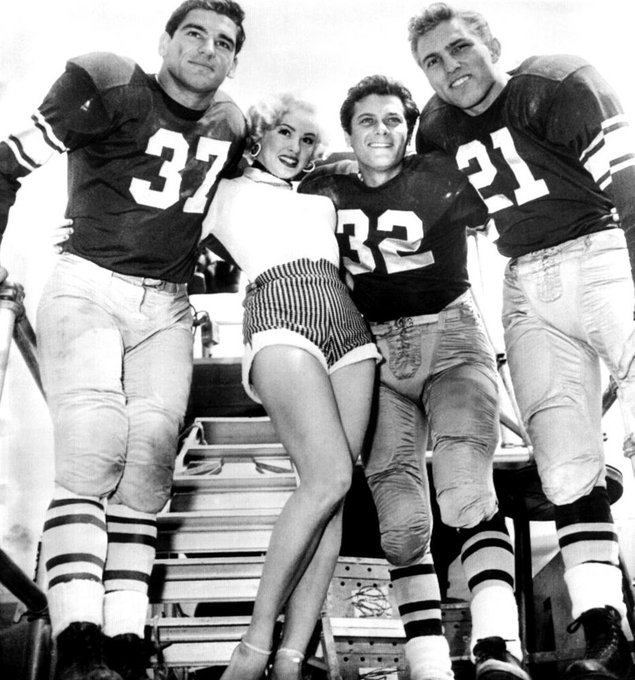 Here she is with USC running backs Al Carmichael (37) and Jim Sears (21), along with actor Tony Curtis (32) from the movie “All-American.” They are wearing actual USC uniforms too.