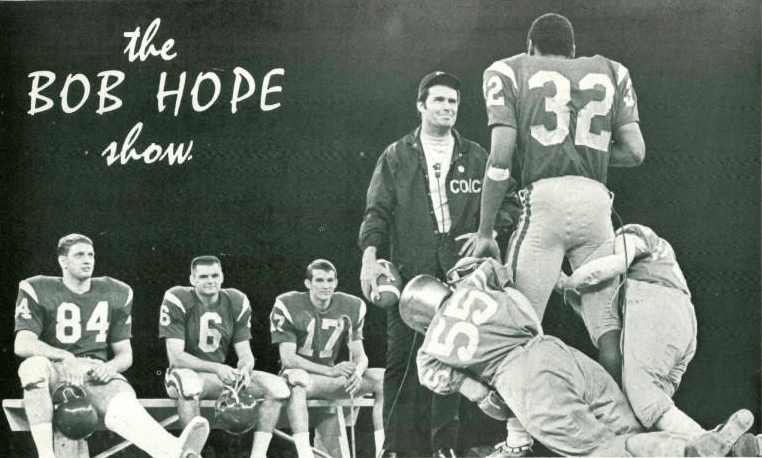 Bob Klein, Steve Sogge, Mike Battle and O.J. Simpson perform a skit with “Coach” James Garner on Nov. 25, 1968 at the Sports Arena for The Bob Hope Show.