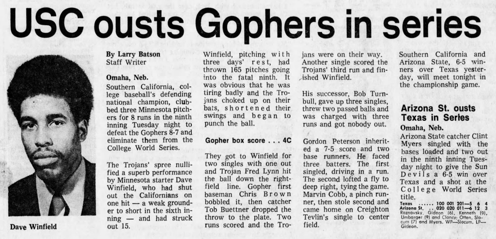 So let’s remember this classic game against Minnesota in 1973. USC trailed 7-0 entering the ninth inning and scored eight runs to win, 8-7, in a semifinal game.