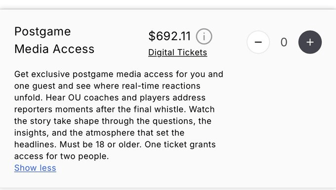 - I can’t believe USC let someone else think of this first. Oklahoma is charging nearly $700 for two fans to go to a post-game press conference. Outrageous.