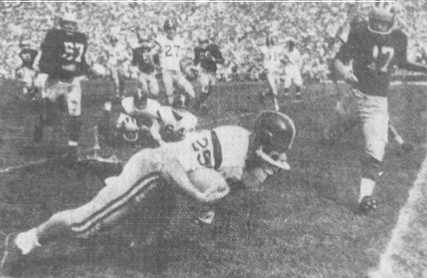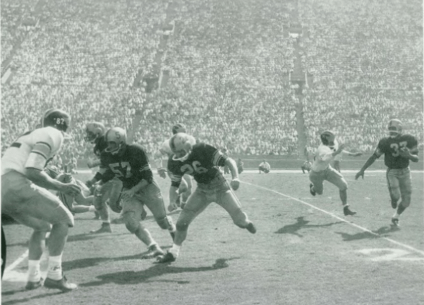 USC halfback Tony Ortega runs for yardage against Michigan in 1957. This was the only season the Trojans ever wore gold helmets.