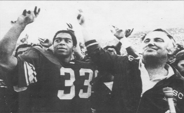 - Allen and John Robinson raise their hands to Conquest after the Trojans’ 22-21 victory over the Bruins in 1981, back when players and coaches would celebrate together after big wins.