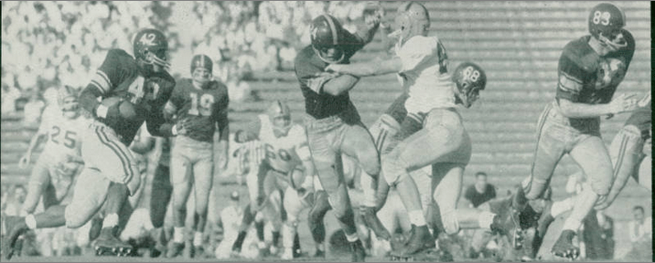 Fullback C. R. Roberts follows the blocking of Don Hoffman (34), Laird Willott (68) and Bob Voiles (83) against the Irish. Roberts is best remembered for a game earlier in the season when USC went to face Texas and was told its African-American players could not stay at its Austin hotel.