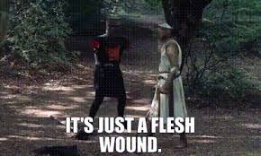 She’s like the Black Knight in Monty Python: “It’s just a flesh wound!”